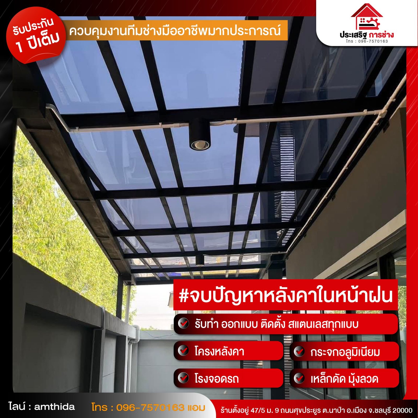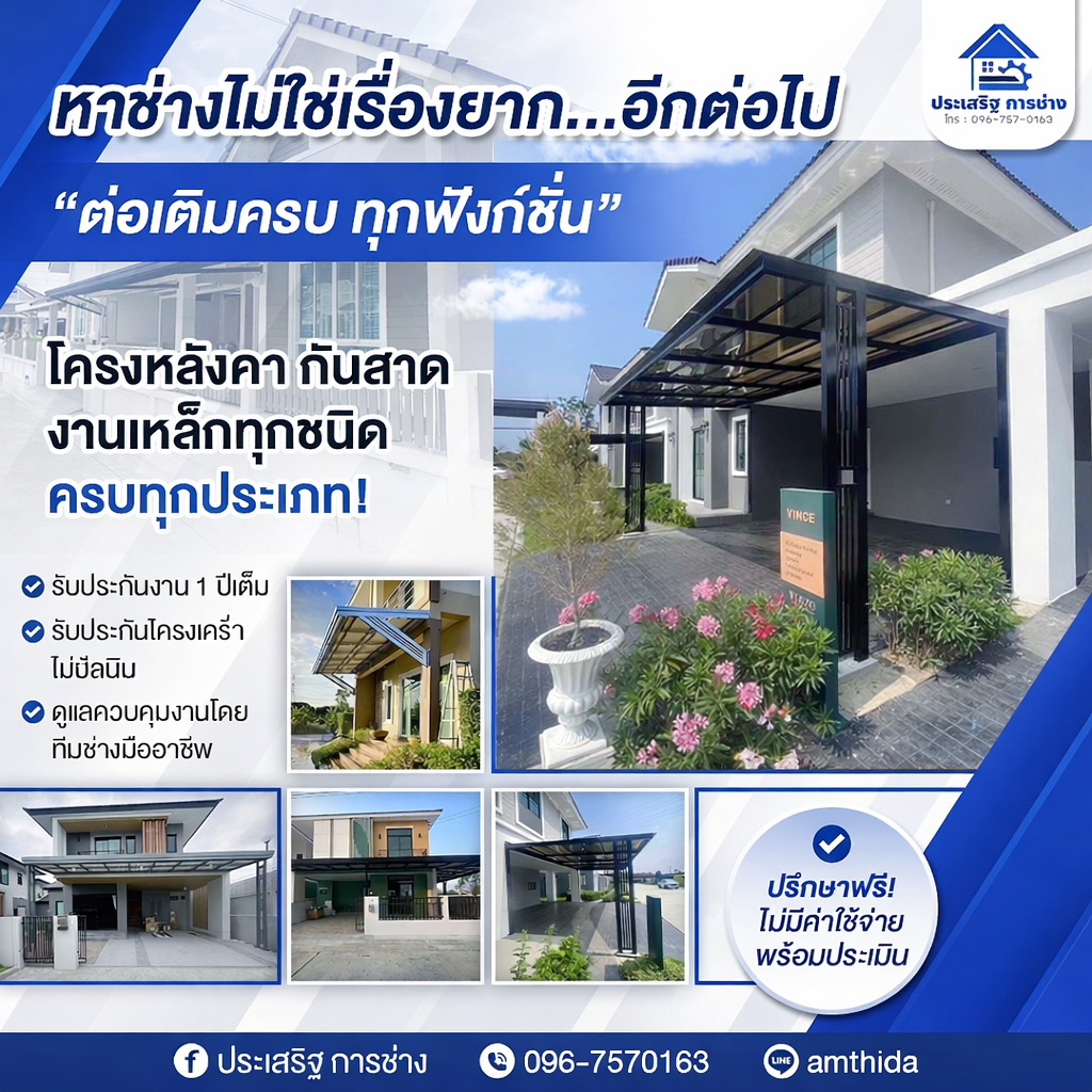 ประเสริฐ การช่าง ทีมงานช่างมืออาชีพ รับงาน ออกแบบ–ผลิต–ติดตั้ง งานโครงสร้างและสแตนเลสแบบครบวงจร โดยเฉพาะงาน โครงหลังคา/โรงจอดรถ ที่เน้นความแข็งแรง งานเรียบร้อย และใช้งานได้จริง พร้อมบริการวัดหน้างานและให้คำแนะนำตามพื้นที่จริง